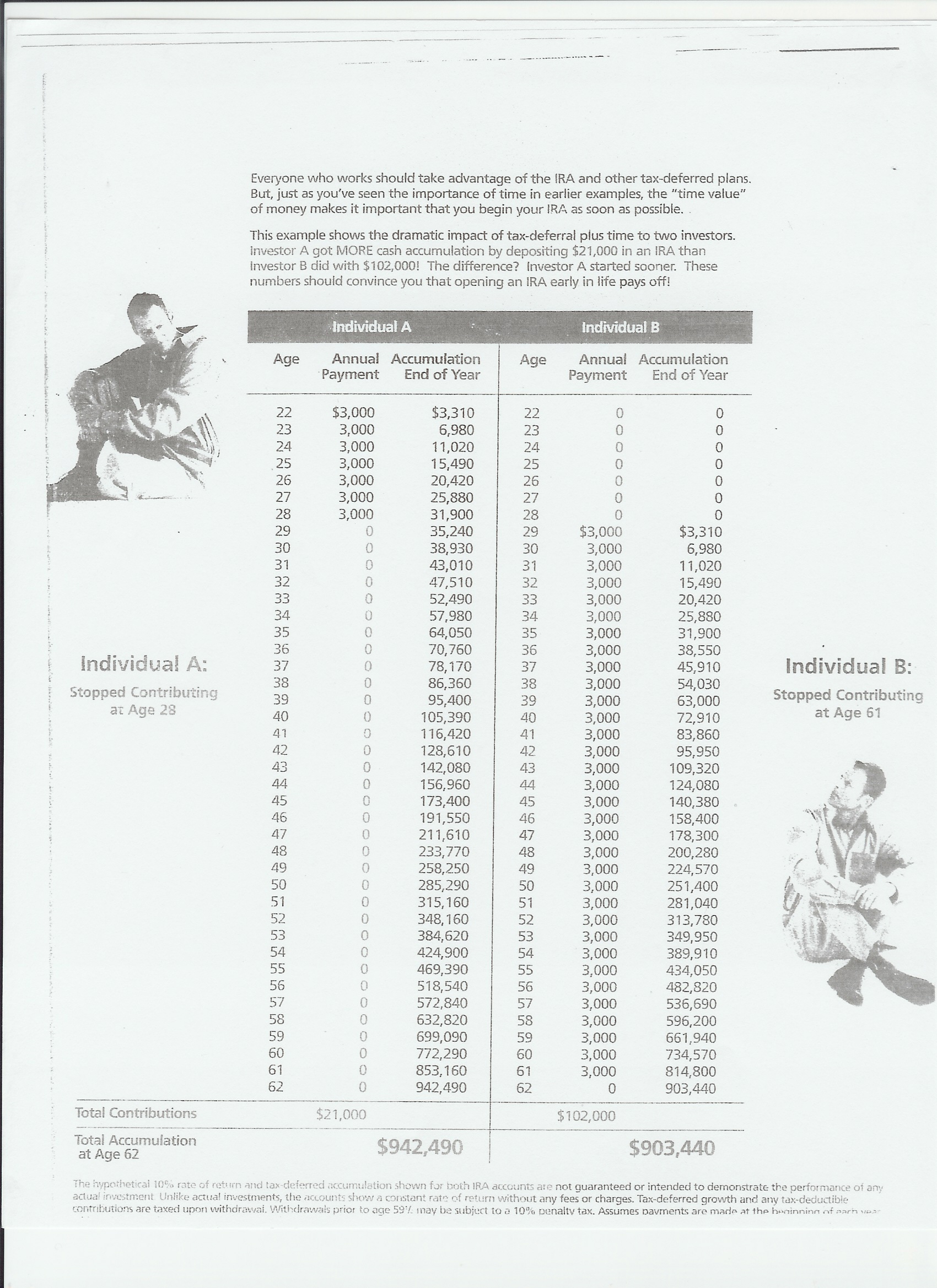 Individual "A" begins saving $3,000 per YEAR (ONLY 10% of an annual salary of $30,000) either after their 22nd